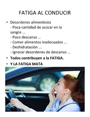 FATIGA AL CONDUCIR • Desordenes alimenticios - Poca cantidad de azúcar en la sangre … - Poco descanso … - Comer alimentos inadecuados … - Deshidratación ... - Ignorar desordenes de descanso … • Todos contribuyen a la FATIGA. • Y LA FATIGA MATA