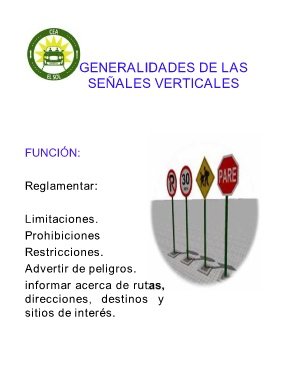 GENERALIDADES DE LAS SEÑALES VERTICALES FUNCIÓN: Reglamentar: Limitaciones. Prohibiciones Restricciones. Advertir de peligros. informar acerca de rutas, direcciones, destinos y sitios de interés.