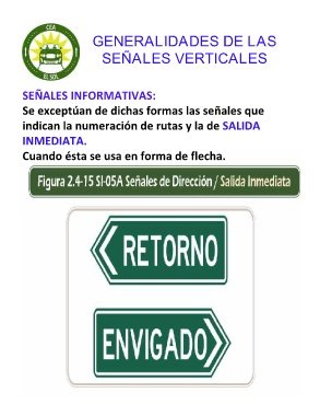 GENERALIDADES DE LAS SEÑALES VERTICALES SEÑALES INFORMATIVAS: Se exceptúan de dichas formas las señales que indican la numeración de rutas y la de SALIDA INMEDIATA. Cuando ésta se usa en forma de flecha.
