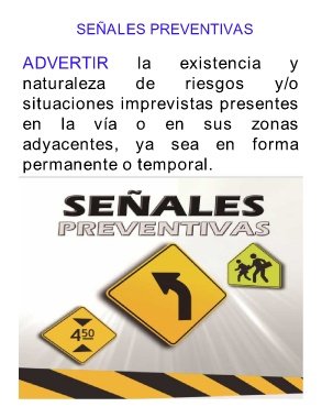 SEÑALES PREVENTIVAS ADVERTIR la existencia y naturaleza de riesgos y/o situaciones imprevistas presentes en la vía o en sus zonas adyacentes, ya sea en forma permanente o temporal.