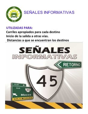 SEÑALES INFORMATIVAS UTILIZADAS PARA: Carriles apropiados para cada destino Inicio de la salida a otras vías. Distancias a que se encuentran los destinos